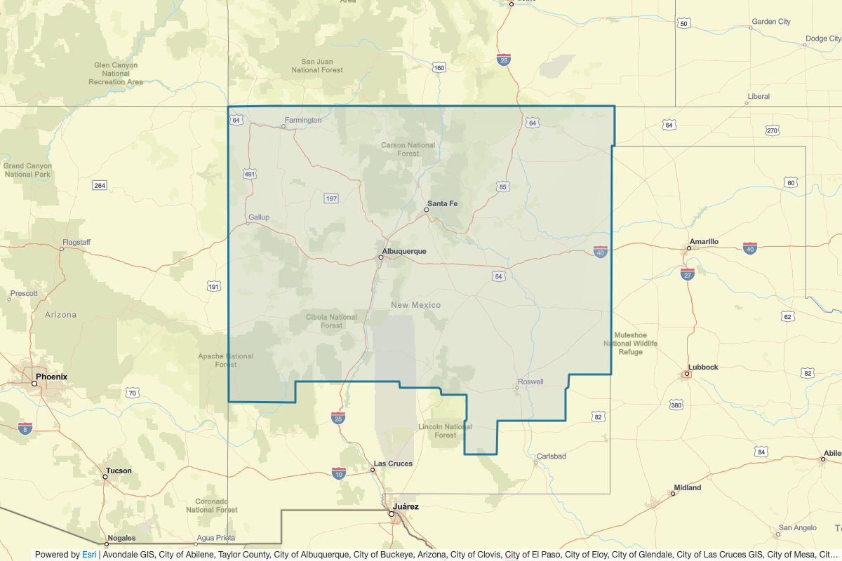 This includes Sierra, Lea, Otero, Grant, Eddy, Baca, Cimarron, Dallam, Archuleta, Montezuma, La Plata, Conejos, Costilla, Las Animas, Rio Arriba, Union, San Juan, Taos, Colfax, Mora, San Juan, Los Alamos, Deaf Smith, Hartley, Oldham, Parmer, Cochran, Bailey, Sandoval, Santa Fe, Socorro, Torrance, Valencia, Bernalillo, Cibola, Lincoln, Catron, McKinley, Curry, De Baca, Guadalupe, Harding, Quay, Roosevelt, Apache, Chaves, San Miguel, and Greenlee