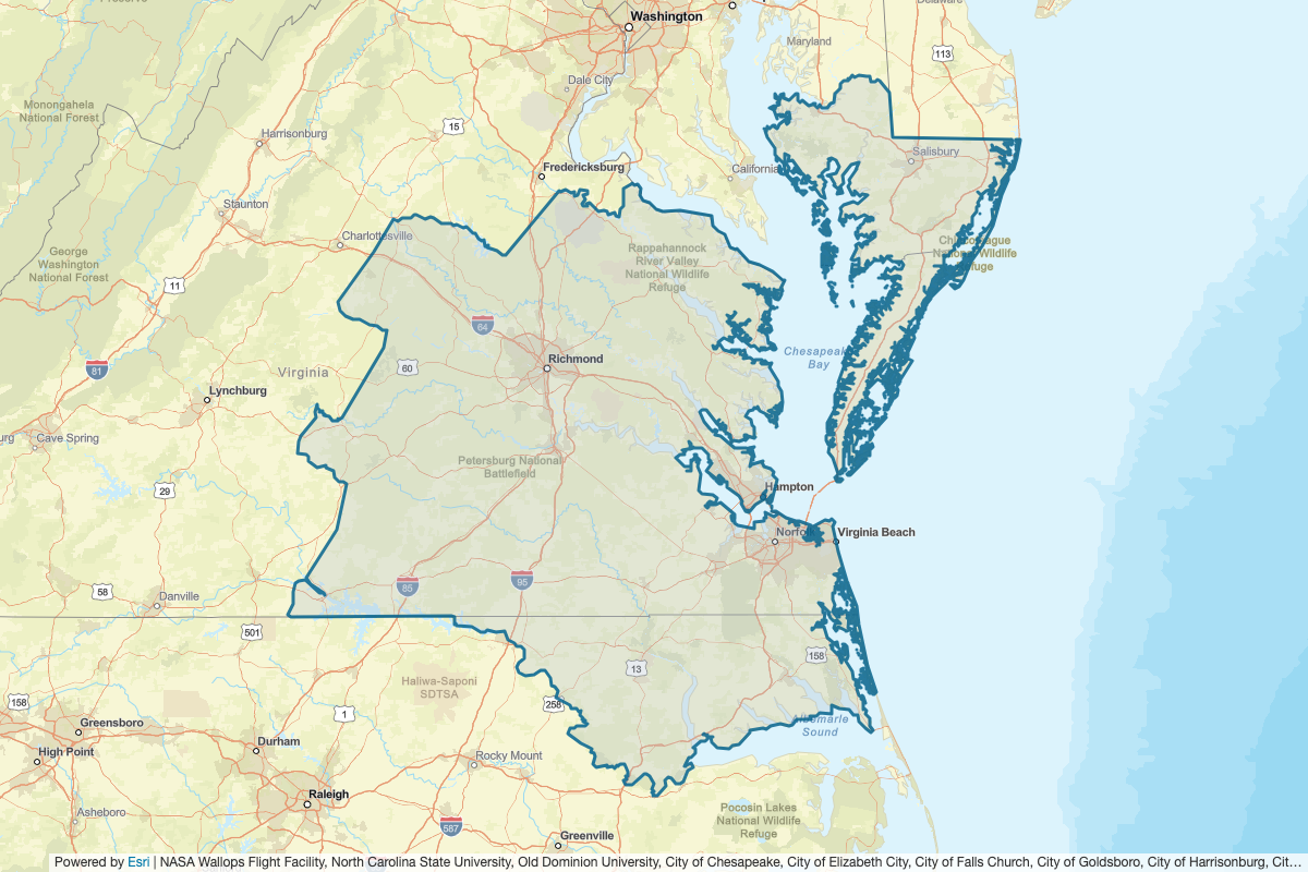 This includes Granville, Halifax, Vance, Warren, Dare, Martin, Washington, Gates, Northampton, Hertford, Bertie, Currituck, Camden, Pasquotank, Perquimans, Chowan, Orange, Spotsylvania, King George, Stafford, New Kent, Nottoway, Powhatan, King William, Sussex, Hanover, Talbot, City of Williamsburg, Southampton, Chesterfield, Greensville, Henrico, Goochland, Dinwiddie, Caroline, Brunswick, Amelia, Louisa, Charles City, Richmond, Essex, City of Petersburg, City of Richmond, City of Colonial Heights, City of Hopewell, Worcester, City of Chesapeake, Mathews, Northumberland, James City, City of Virginia Beach, Middlesex, Gloucester, Lancaster, Surry, City of Hampton, City of Newport News, City of Poquoson, King and Queen, Dorchester, Westmoreland, Wicomico, Prince George, City of Franklin, City of Emporia, Northampton, Somerset, Caroline, Sussex, Accomack, York, Isle of Wight, City of Norfolk, City of Portsmouth, City of Suffolk, Halifax, Charlotte, Buckingham, Appomattox, Albemarle, Prince Edward, Fluvanna, Cumberland, Lunenburg, and Mecklenburg