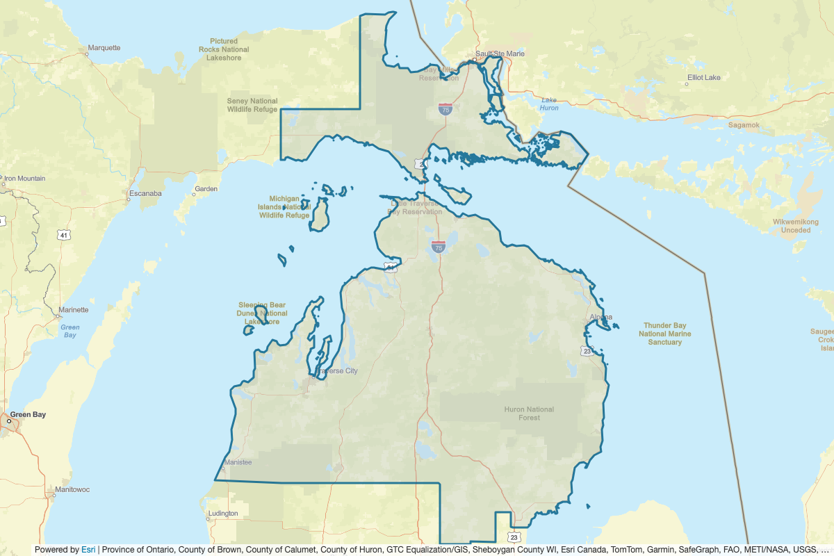 This includes Roscommon, Alcona, Wexford, Iosco, Clare, Crawford, Gladwin, Kalkaska, Lake, Manistee, Midland, Missaukee, Montmorency, Ogemaw, Osceola, Oscoda, Otsego, Leelanau, Alpena, Cheboygan, Charlevoix, Grand Traverse, Luce, Mackinac, Schoolcraft, Presque Isle, Antrim, Arenac, Bay, Emmet, Benzie, Mason, and Chippewa