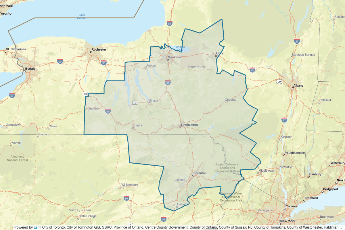 This includes Yates, Allegany, Broome, Chemung, Chenango, Cortland, Delaware, Lewis, Livingston, Madison, Montgomery, Onondaga, Ontario, Orange, Otsego, Schoharie, Schuyler, Seneca, Steuben, Sullivan, Tioga, Tompkins, Bradford, Columbia, Lackawanna, Luzerne, Pike, Potter, Schuylkill, Sullivan, Susquehanna, Tioga, Wyoming, Wayne, Oswego, Cayuga, Oneida, Herkimer, Greene, Ulster, Lycoming, Wayne, Sussex, Monroe, and Carbon
