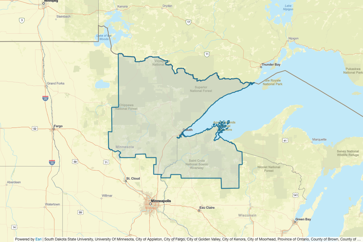 This includes St. Louis, Chisago, Crow Wing, Kanabec, Mille Lacs, Morrison, Pine, Barron, Burnett, Washburn, Polk, Koochiching, Cass, Aitkin, Itasca, Douglas, Carlton, Gogebic, Lincoln, Oneida, Vilas, Taylor, Sawyer, Rusk, Price, Lake, Cook, Iron, Bayfield, Ashland, Lake of the Woods, Hubbard, Todd, Wadena, and Beltrami