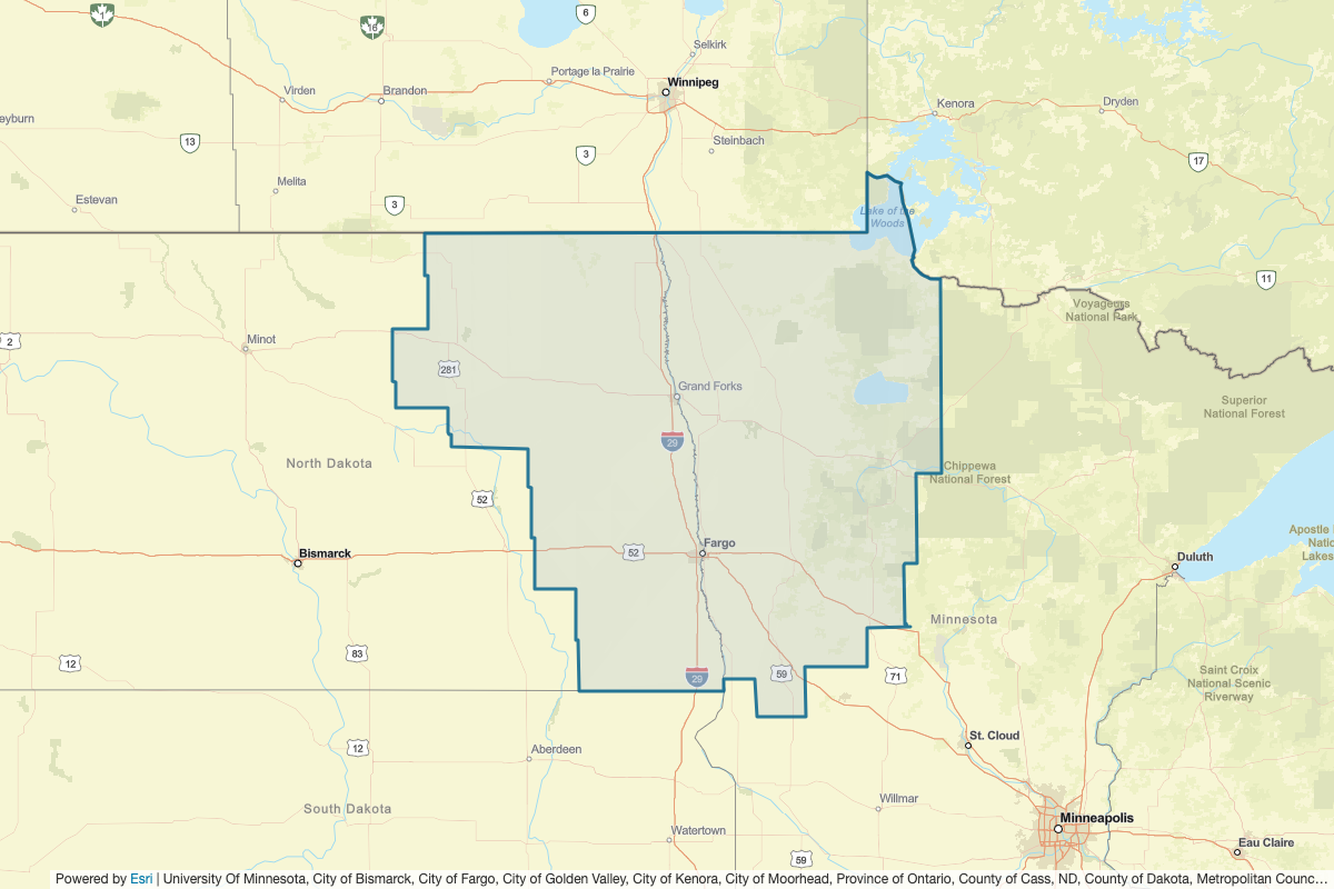 This includes Koochiching, Cass, Itasca, Eddy, Foster, Grand Forks, Griggs, LaMoure, Nelson, Pembina, Pierce, Ramsey, Ransom, Rolette, Sargent, Steele, Stutsman, Towner, Traill, Lake of the Woods, Douglas, Grant, Hubbard, Kittson, Mahnomen, Norman, Pennington, Red Lake, Roseau, Stevens, Todd, Traverse, Wadena, Clay, Otter Tail, Becker, Clearwater, Polk, Marshall, Wilkin, Barnes, Benson, Cass, Cavalier, Dickey, Wells, Roberts, Marshall, Richland, Walsh, and Beltrami