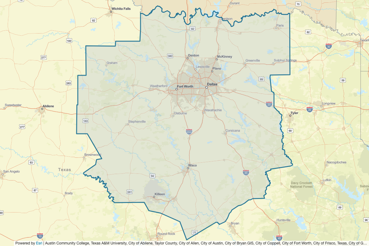 This includes Dallas, Delta, Denton, Eastland, Ellis, Erath, Falls, Franklin, Freestone, Hamilton, Henderson, Hill, Hood, Hopkins, Houston, Hunt, Jack, Johnson, Kaufman, Lampasas, Lee, Leon, Limestone, McLennan, Madison, Milam, Mills, Navarro, Palo Pinto, Rains, Robertson, Rockwall, San Saba, Shackelford, Smith, Somervell, Stephens, Tarrant, Throckmorton, Van Zandt, Williamson, Wise, Wood, Young, Collin, Cherokee, Callahan, Burnet, Burleson, Brown, Brazos, Bosque, Bell, Anderson, Comanche, Coryell, Parker, Bryan, Choctaw, Jefferson, Love, Marshall, Fannin, Grayson, Lamar, Montague, Red River, Clay, Archer, and Cooke