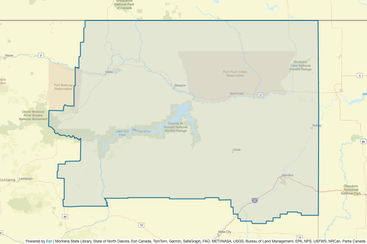 This includes Blaine, Custer, Daniels, Dawson, Fallon, Fergus, Garfield, McCone, Musselshell, Petroleum, Prairie, Richland, Sheridan, Wibaux, Phillips, Rosebud, Roosevelt, Valley, Divide, Golden Valley, Williams, and McKenzie