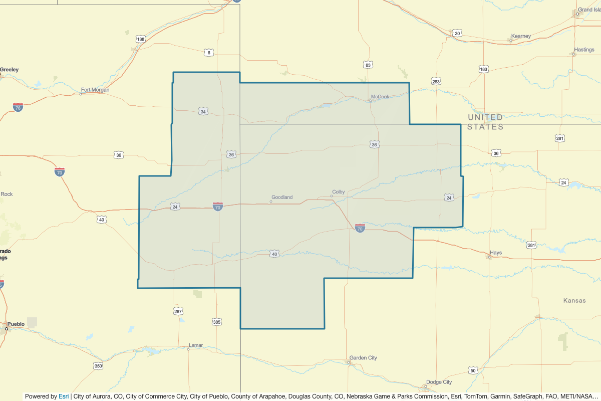 This includes Cheyenne, Prowers, Wichita, Wallace, Trego, Scott, Ness, Logan, Lane, Kearny, Hamilton, Greeley, Gove, Kiowa, Dundy, Frontier, Furnas, Hayes, Hitchcock, Thomas, Sherman, Sheridan, Rooks, Rawlins, Phillips, Norton, Cheyenne, Decatur, Graham, Chase, Red Willow, Kit Carson, Logan, Phillips, Washington, Yuma, and Lincoln