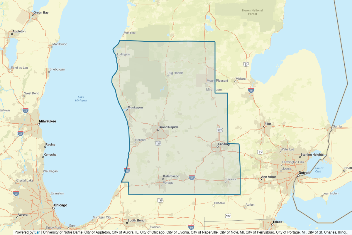 This includes Roscommon, Saginaw, St. Joseph, Shiawassee, Washtenaw, Wexford, Barry, Branch, Calhoun, Cass, Clare, Clinton, Eaton, Gladwin, Gratiot, Hillsdale, Ingham, Ionia, Isabella, Jackson, Kalamazoo, Kent, Lake, Lenawee, Livingston, Manistee, Mecosta, Midland, Missaukee, Montcalm, Newaygo, Osceola, Berrien, Van Buren, Allegan, Oceana, Muskegon, Ottawa, and Mason