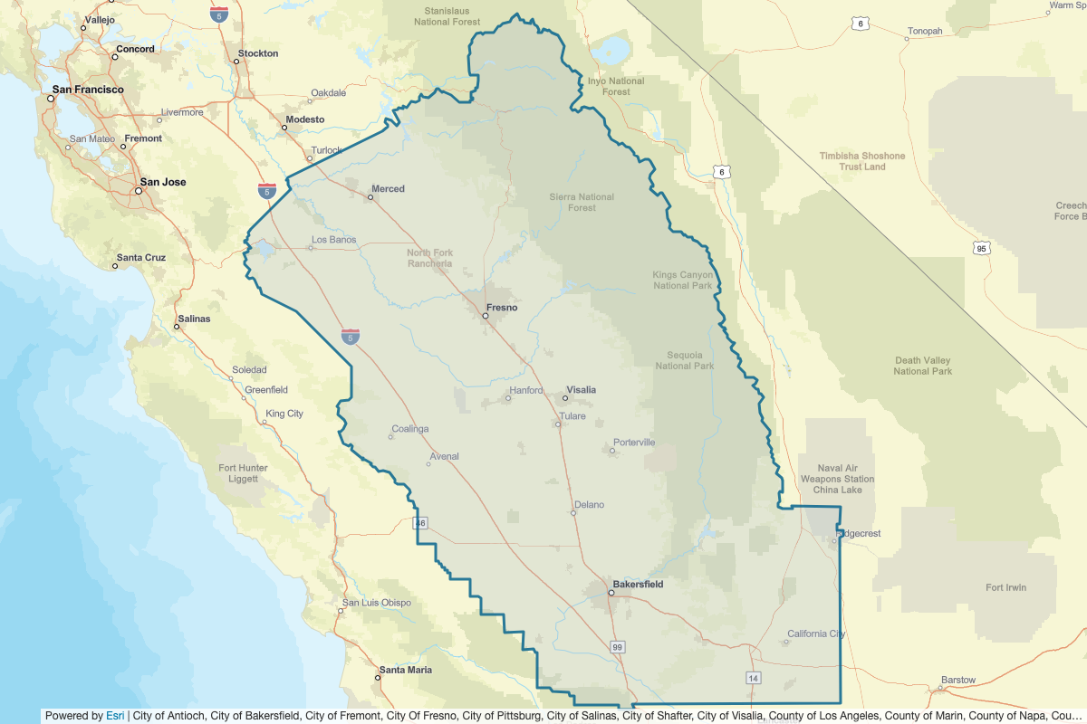 This includes Santa Barbara, San Bernardino, Kings, Los Angeles, Ventura, Kern, Tulare, San Luis Obispo, Stanislaus, Mono, Monterey, Fresno, San Benito, Merced, Tuolumne, Mariposa, Madera, Santa Clara, and Inyo