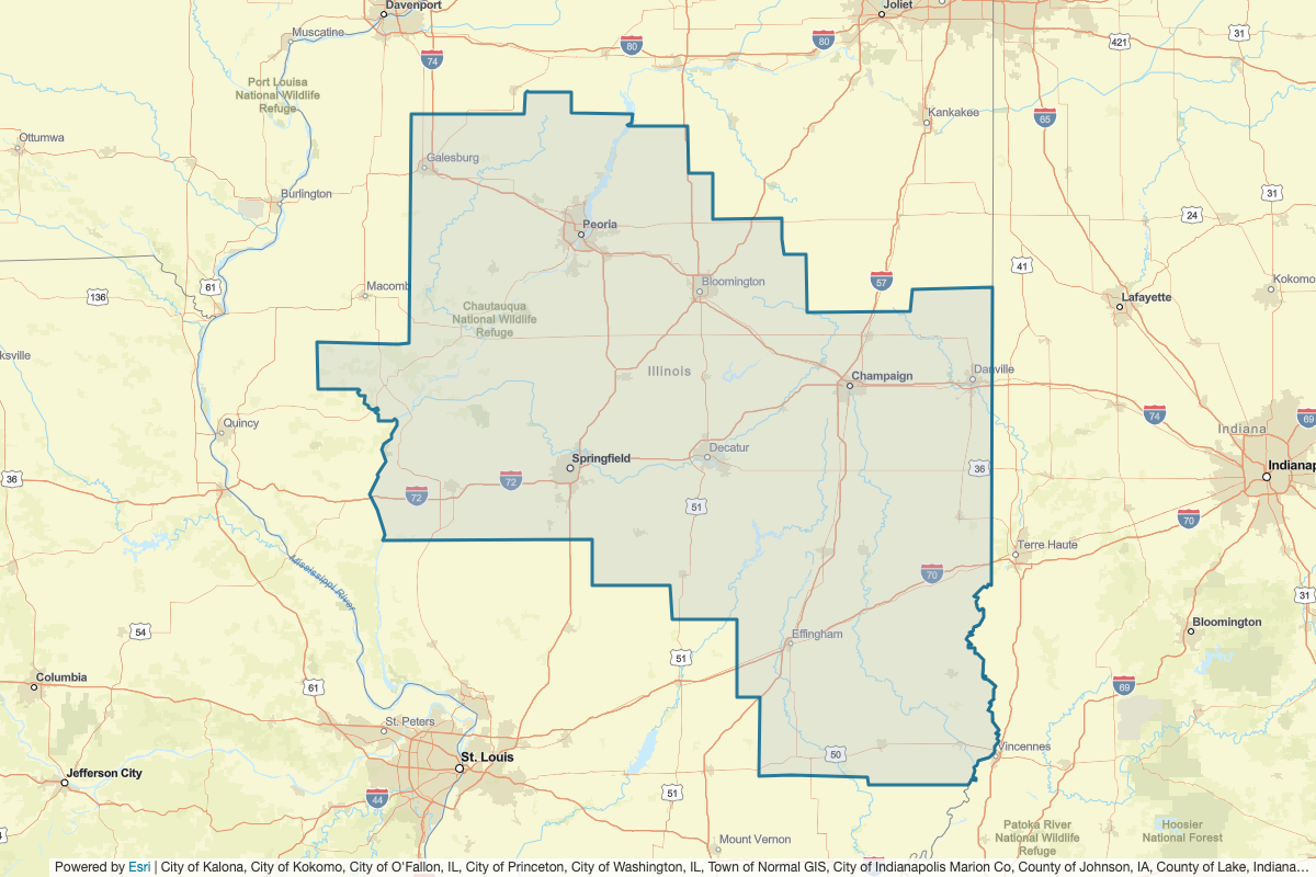 This includes Knox, Lawrence, Marion, Sullivan, Clay, Crawford, Edwards, Effingham, Fayette, Richland, Wabash, Wayne, Jasper, Iroquois, La Salle, Henry, Livingston, Logan, McDonough, McLean, Macon, Macoupin, Marshall, Mason, Woodford, Adams, Brown, Bureau, Cass, Champaign, Christian, Clark, Coles, Cumberland, De Witt, Douglas, Edgar, Greene, Ford, Warren, Vigo, Vermillion, Benton, Menard, Mercer, Montgomery, Morgan, Moultrie, Peoria, Piatt, Pike, Putnam, Sangamon, Schuyler, Scott, Shelby, Stark, Tazewell, Vermilion, Warren, Fulton, Hancock, and Knox