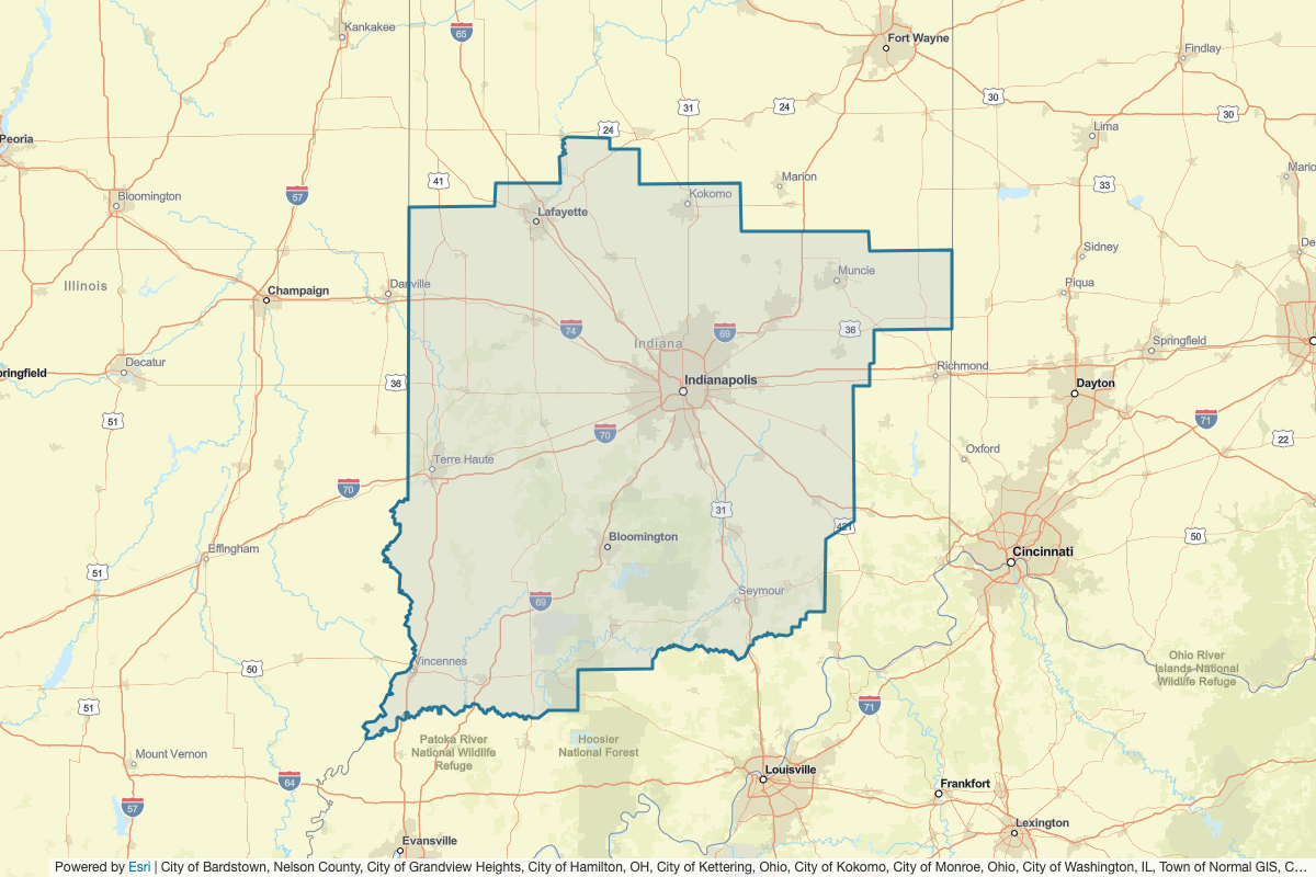 This includes Scott, Washington, Pike, Orange, Martin, Lawrence, Knox, Jennings, Jefferson, Jackson, Greene, Daviess, Dubois, Lawrence, Sullivan, Crawford, Gibson, Wabash, Tipton, Tippecanoe, Shelby, Rush, Randolph, Putnam, Parke, Owen, Morgan, Montgomery, Monroe, Miami, Darke, Clark, Edgar, Warren, Vigo, Vermillion, Marion, Madison, Johnson, Jay, Howard, Henry, Hendricks, Hancock, Hamilton, Grant, Franklin, Fountain, Bartholomew, Benton, Blackford, Boone, Brown, Carroll, Cass, Clinton, Decatur, Delaware, Fayette, Wayne, White, Clay, Ripley, and Vermilion