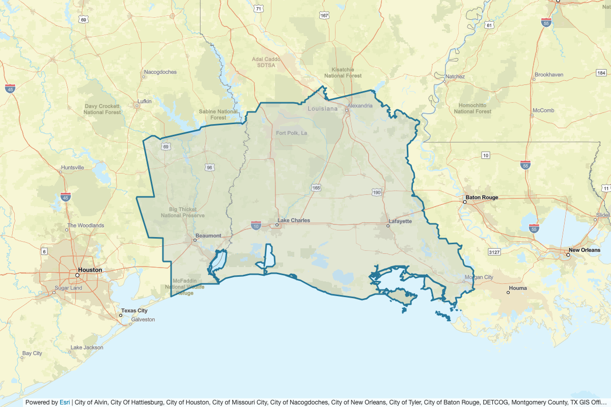 This includes St. Mary, St. Landry, Sabine, Rapides, Natchitoches, La Salle, Lafayette, Grant, Evangeline, Concordia, Catahoula, Beauregard, Allen, Acadia, Vernon, Pointe Coupee, Avoyelles, West Feliciana, Calcasieu, Jefferson Davis, Iberville, Vermilion, Iberia, Assumption, St. Martin, Terrebonne, Cameron, Hardin, Newton, Sabine, San Augustine, Tyler, Angelina, Jefferson, Orange, Chambers, Jasper, Liberty, and Polk