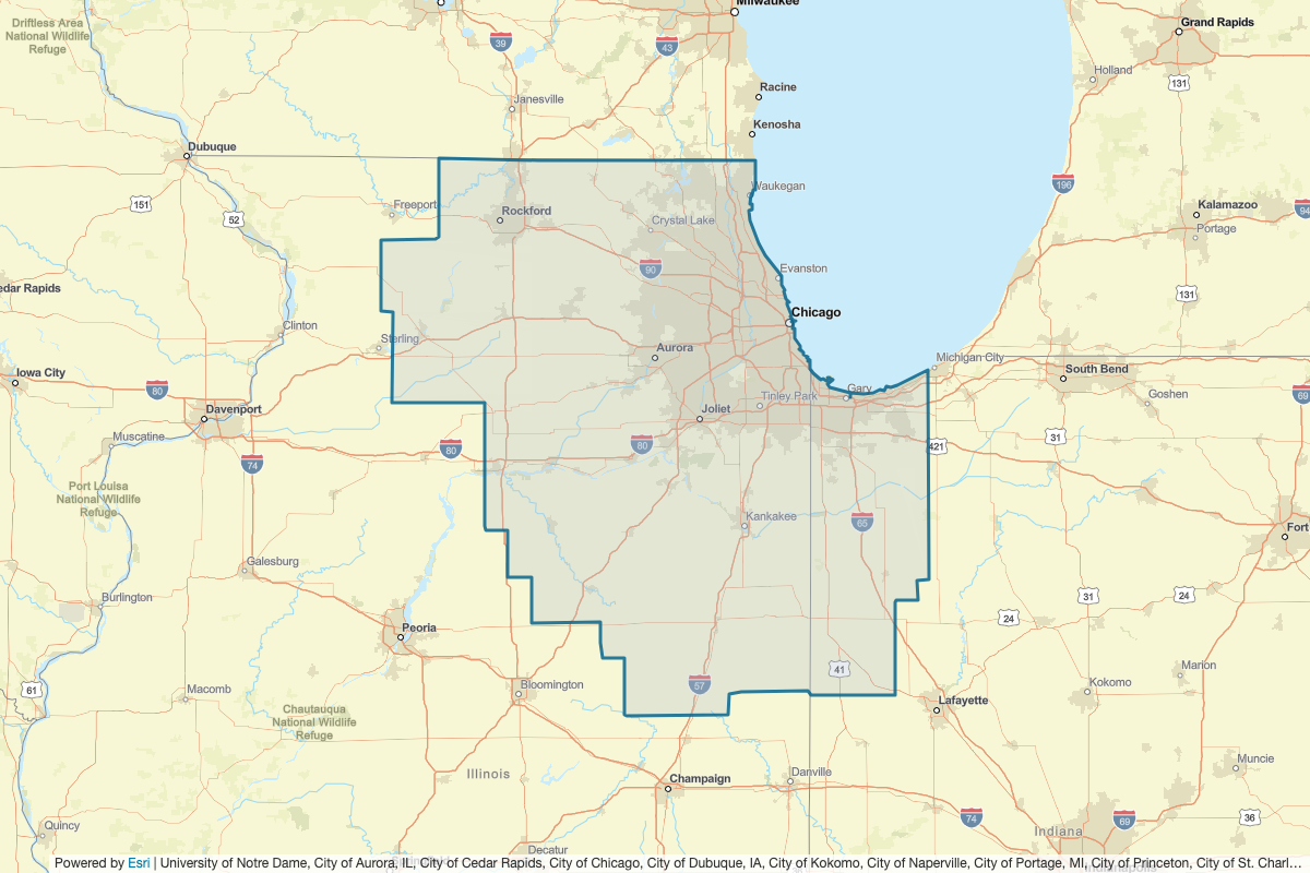 This includes Kankakee, Kendall, Iroquois, La Salle, Livingston, McLean, Marshall, Tippecanoe, Starke, Pulaski, Porter, Newton, Woodford, Grundy, Bureau, Champaign, Ford, Warren, Benton, White, Lake, La Porte, Putnam, Vermilion, Will, Jasper, Kane, McHenry, Winnebago, Boone, Carroll, De Kalb, DuPage, Ogle, Stephenson, Whiteside, Lee, Green, Walworth, Rock, Kenosha, Lake, and Cook