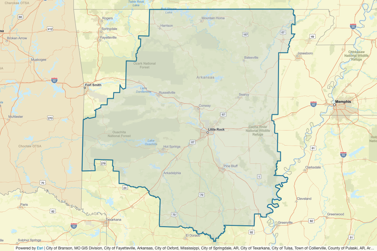 This includes Bolivar, Ashley, Baxter, Arkansas, Bradley, Calhoun, Carroll, Chicot, Clark, Clay, Cleburne, Cleveland, Columbia, Conway, Craighead, Cross, Dallas, Desha, Drew, Faulkner, Franklin, Fulton, Garland, Grant, Greene, Hempstead, Hot Spring, Howard, Independence, Izard, Jackson, Jefferson, Johnson, Lawrence, Lee, Lincoln, Logan, Lonoke, Marion, Monroe, Montgomery, Madison, Nevada, Newton, Ouachita, Perry, Phillips, Pike, Poinsett, Polk, Pope, Prairie, Pulaski, Randolph, St. Francis, Saline, Scott, Searcy, Sebastian, Sevier, Sharp, Stone, Union, Van Buren, White, Woodruff, Yell, Boone, Howell, Oregon, Ozark, Ripley, Taney, Le Flore, and McCurtain