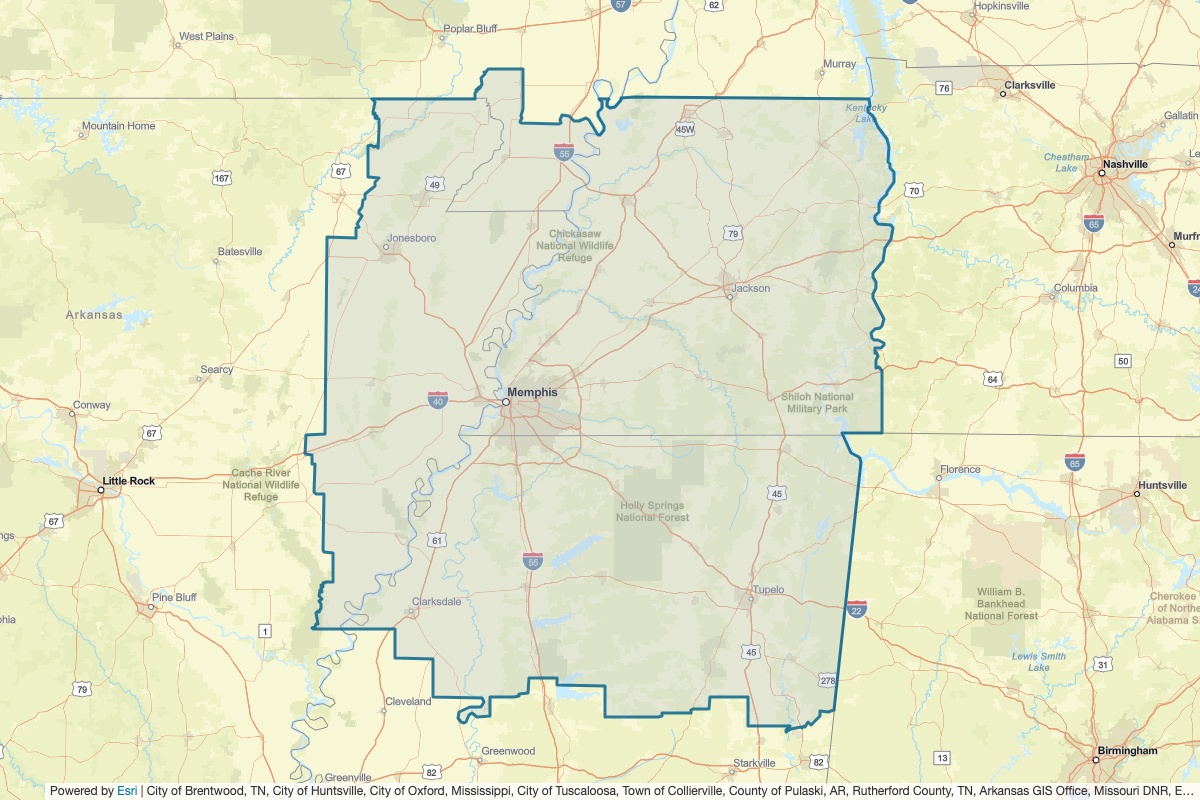 This includes Benton, Yalobusha, Webster, Union, Tishomingo, Tippah, Tate, Tallahatchie, Prentiss, Pontotoc, Panola, Monroe, Marshall, Clay, Chickasaw, Calhoun, Alcorn, Perry, Franklin, Lamar, Lauderdale, Marion, Shelby, Stewart, Wayne, Weakley, Colbert, Lowndes, Lee, Lafayette, Itawamba, Grenada, DeSoto, Benton, Carroll, Chester, Crockett, Decatur, Dyer, Fayette, Gibson, Hardeman, Hardin, Haywood, Henderson, Henry, Houston, Humphreys, Lake, Lauderdale, McNairy, Madison, Tipton, Obion, Dunklin, Pemiscot, Mississippi, Quitman, Calloway, Graves, Hickman, Butler, Fulton, New Madrid, Ripley, Stoddard, Tunica, Sunflower, Coahoma, Bolivar, Leflore, Arkansas, Clay, Craighead, Crittenden, Cross, Desha, Greene, Jackson, Lawrence, Lee, Monroe, Phillips, Poinsett, Randolph, St. Francis, and Woodruff