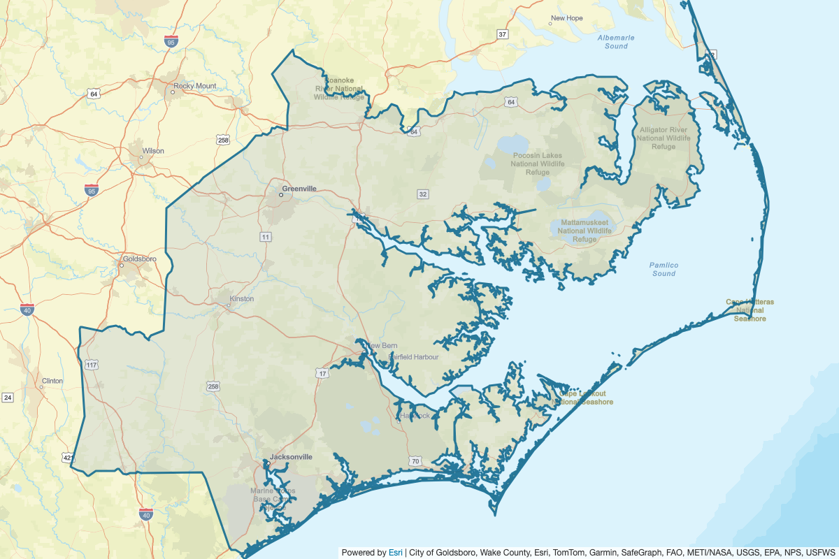This includes Edgecombe, Greene, Halifax, Pitt, Wilson, Lenoir, Wayne, Sampson, Dare, Pamlico, Jones, Duplin, Craven, Beaufort, Martin, Carteret, Onslow, Pender, Hyde, Washington, Tyrrell, and Bertie
