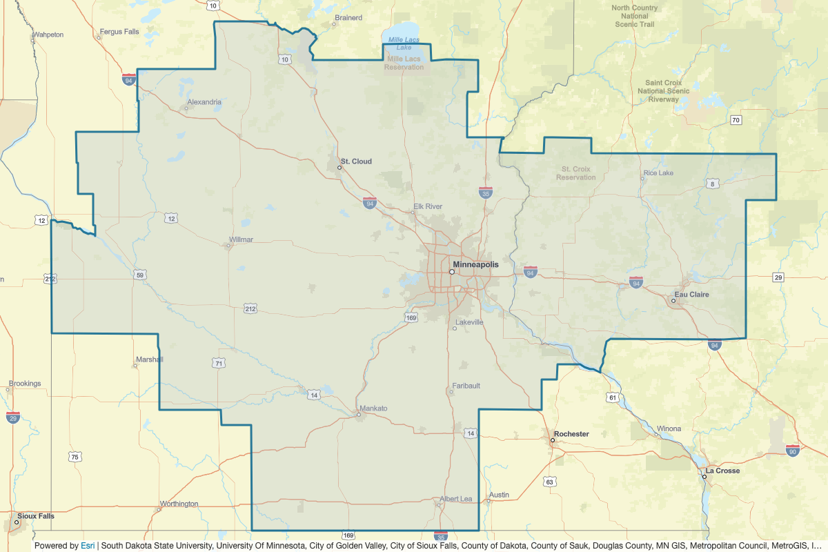 This includes Worth, Winnebago, Kossuth, Anoka, Benton, Carver, Chisago, Crow Wing, Dakota, Dodge, Faribault, Freeborn, Goodhue, Hennepin, Isanti, Kanabec, Le Sueur, McLeod, Mille Lacs, Morrison, Mower, Nicollet, Olmsted, Pine, Ramsey, Rice, Scott, Sherburne, Sibley, Steele, Wabasha, Waseca, Washington, Wright, Blue Earth, Barron, Buffalo, Burnett, Dunn, Pepin, Washburn, St. Croix, Polk, Pierce, Cass, Aitkin, Emmet, Chippewa, Clark, Eau Claire, Jackson, Trempealeau, Taylor, Sawyer, Rusk, Price, Grant, Deuel, Lac qui Parle, Brown, Chippewa, Cottonwood, Douglas, Grant, Jackson, Kandiyohi, Lincoln, Lyon, Martin, Meeker, Murray, Pope, Redwood, Renville, Stearns, Stevens, Swift, Todd, Traverse, Wadena, Watonwan, Yellow Medicine, Big Stone, and Otter Tail