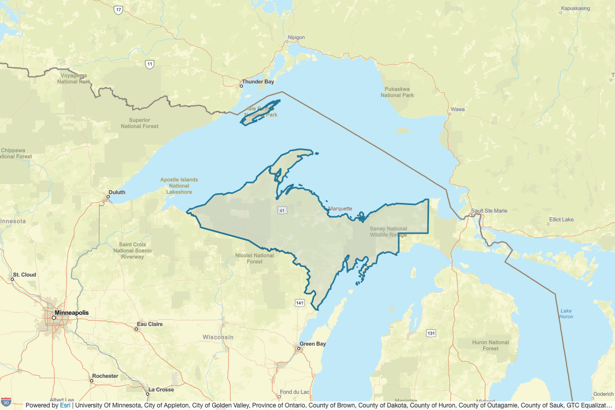 This includes Dickinson, Iron, Gogebic, Keweenaw, Baraga, Marquette, Delta, Luce, Mackinac, Schoolcraft, Menominee, Alger, Ontonagon, Houghton, Florence, Forest, Vilas, Iron, Marinette, and Chippewa