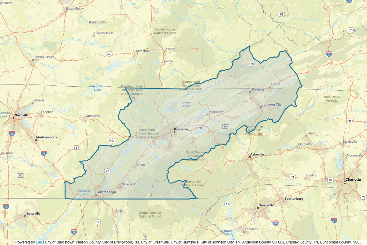 This includes Rabun, Ashe, Avery, Haywood, Macon, Madison, Mitchell, Watauga, Yancey, Sullivan, Unicoi, Washington, Hamblen, Hancock, Hawkins, Jefferson, Johnson, Cocke, Carter, Greene, Whitfield, Walker, Union, Towns, Fannin, Murray, Catoosa, Dade, Jackson, Russell, Scott, Smyth, Tazewell, Washington, Wise, Grayson, Dickenson, Buchanan, Lee, Pike, Harlan, Letcher, City of Norton, City of Bristol, Wayne, Whitley, Bell, Cherokee, Clay, Graham, Swain, Pickett, Rhea, Roane, Scott, Sequatchie, Union, Van Buren, Warren, McCreary, Loudon, Anderson, Bledsoe, Bradley, Campbell, Claiborne, Cumberland, Fentress, Franklin, Grainger, Grundy, Hamilton, Knox, McMinn, Marion, Meigs, Morgan, Monroe, Sevier, Blount, and Polk