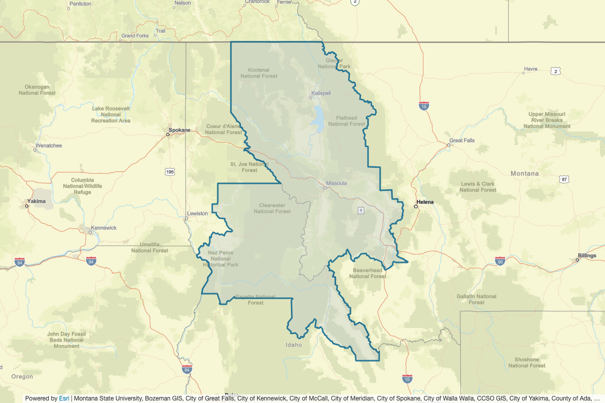 This includes Beaverhead, Deer Lodge, Jefferson, Madison, Mineral, Silver Bow, Lincoln, Powell, Teton, Missoula, Granite, Lake, Sanders, Flathead, Glacier, Pondera, Lewis and Clark, Ravalli, Bonner, Boundary, Clark, Lewis, Shoshone, Valley, Idaho, Clearwater, Nez Perce, Latah, Lemhi, Butte, Adams, Wallowa, and Custer