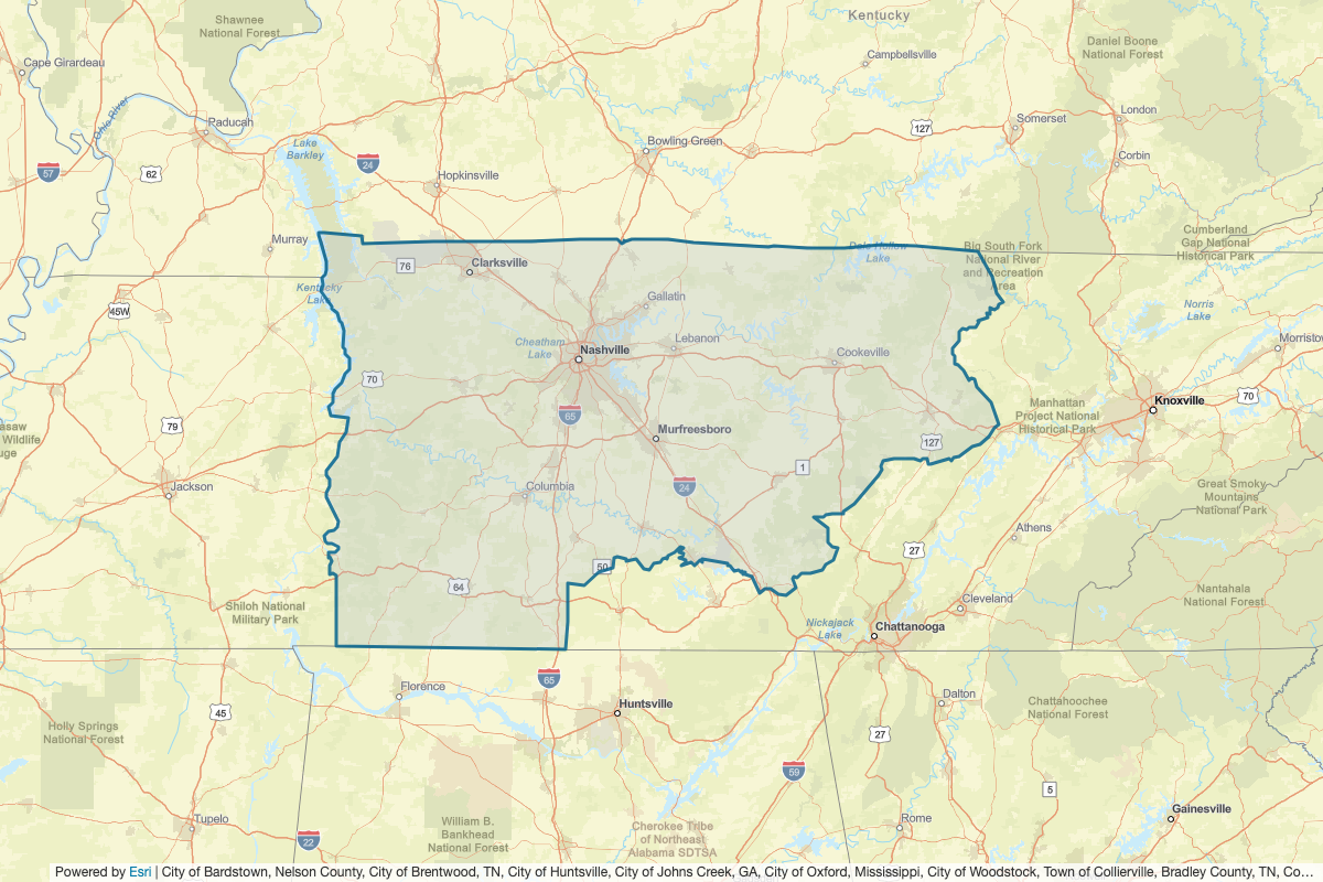 This includes Limestone, Monroe, Simpson, Todd, Wayne, Allen, Cumberland, Clinton, Overton, Pickett, Putnam, Rhea, Roane, Robertson, Rutherford, Scott, Sequatchie, Smith, Sumner, Trousdale, Van Buren, Warren, Williamson, Logan, Wilson, White, Dickson, Bedford, Bledsoe, Cannon, Cheatham, Clay, Coffee, Cumberland, Davidson, De Kalb, Fentress, Franklin, Giles, Grundy, Hickman, Jackson, Lawrence, Lewis, Lincoln, Macon, Marion, Marshall, Moore, Montgomery, Maury, Morgan, Trigg, Calloway, Christian, Perry, Lauderdale, Stewart, Wayne, Benton, Decatur, Hardin, Henry, Houston, and Humphreys