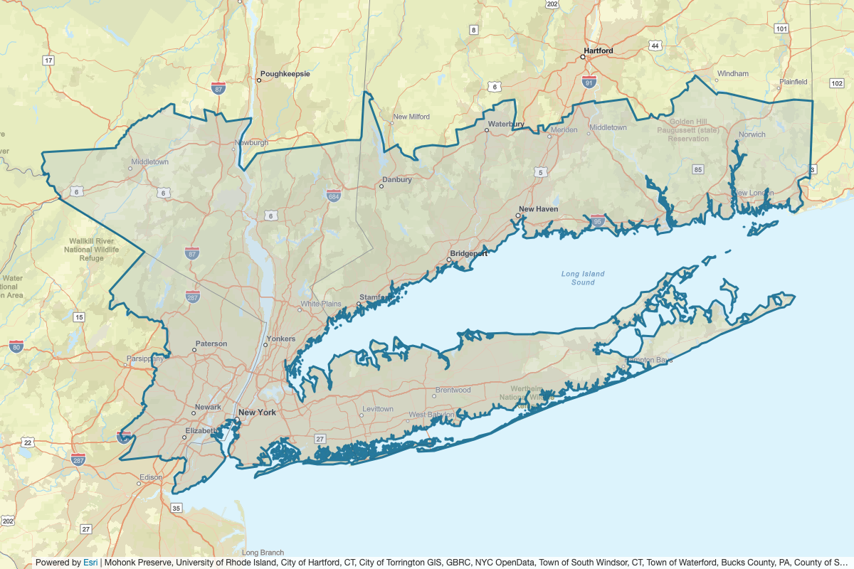This includes Hartford, Tolland, Windham, New Haven, Litchfield, Washington, Kent, New London, Middlesex, Suffolk, Orange, Putnam, Rockland, Sullivan, Pike, Richmond, Hudson, Bronx, Union, Passaic, Westchester, Ulster, Dutchess, Bergen, Nassau, Essex, Fairfield, Queens, Kings, Morris, Somerset, Sussex, Middlesex, and New York (Manhattan)