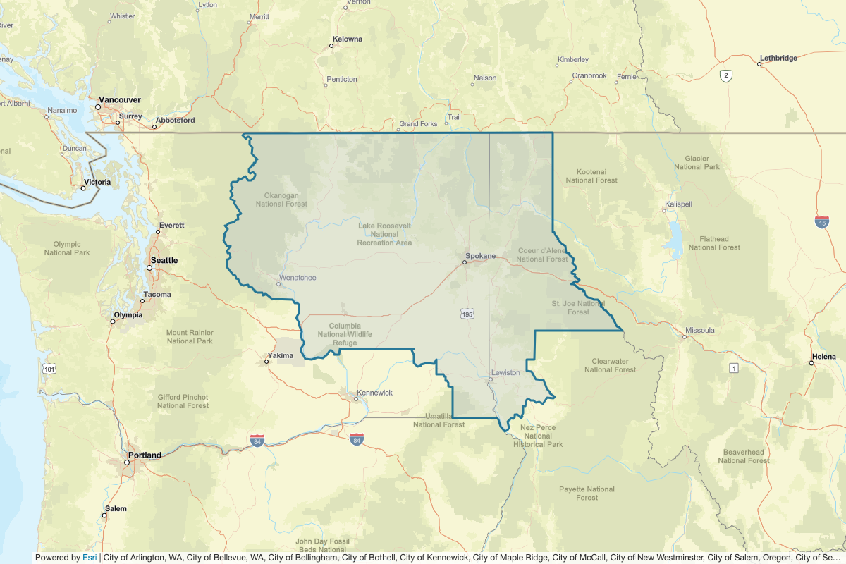 This includes Mineral, Lincoln, Sanders, Bonner, Boundary, Lewis, Shoshone, Ferry, Franklin, Pend Oreille, Stevens, Whitman, Idaho, Clearwater, Nez Perce, Benewah, Latah, Kootenai, Wallowa, Garfield, Columbia, Spokane, Okanogan, Douglas, Asotin, Kittitas, Lincoln, Grant, Chelan, Adams, Yakima, Benton, Whatcom, King, Snohomish, and Skagit