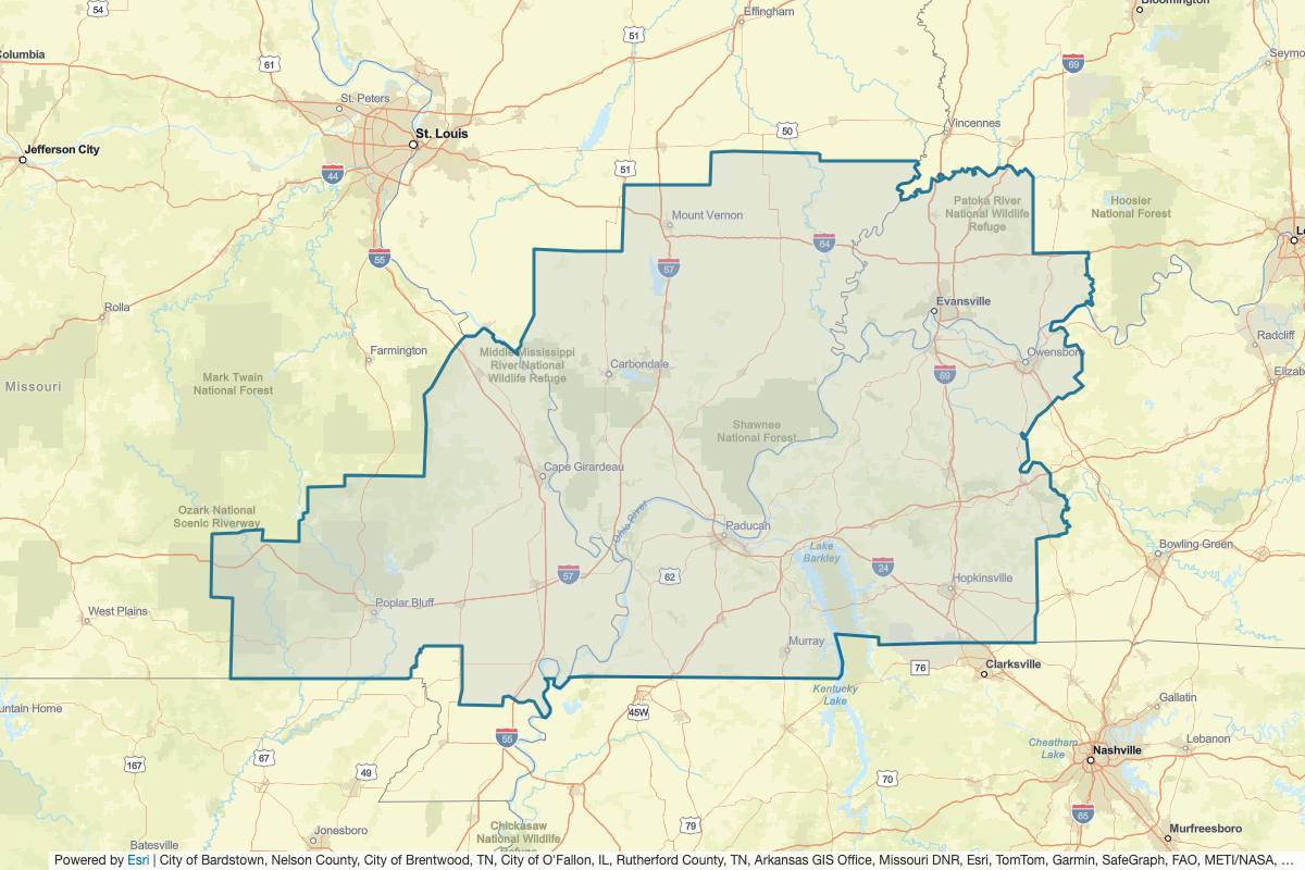 This includes Muhlenberg, Ohio, Todd, Butler, Daviess, Hancock, Spencer, Pike, Perry, Robertson, Knox, Daviess, Dubois, Warrick, Logan, McLean, Montgomery, Stewart, Weakley, Henry, Lake, Obion, Dunklin, Pemiscot, Marshall, Trigg, Union, Webster, Ballard, Caldwell, Calloway, Carlisle, Christian, Hopkins, Crittenden, Graves, Hickman, Henderson, Jackson, Jefferson, Johnson, Lawrence, Marion, Massac, Vanderburgh, Posey, Alexander, Clay, Edwards, Gibson, Livingston, Lyon, McCracken, Perry, Pope, Pulaski, Randolph, Richland, Saline, Union, Wabash, Washington, Wayne, White, Williamson, Franklin, Gallatin, Hardin, Hamilton, Bollinger, Butler, Cape Girardeau, Carter, Fulton, Iron, Madison, Mississippi, New Madrid, Oregon, Perry, Reynolds, Ripley, Ste. Genevieve, St. Francois, Scott, Shannon, Stoddard, Wayne, Clay, and Randolph