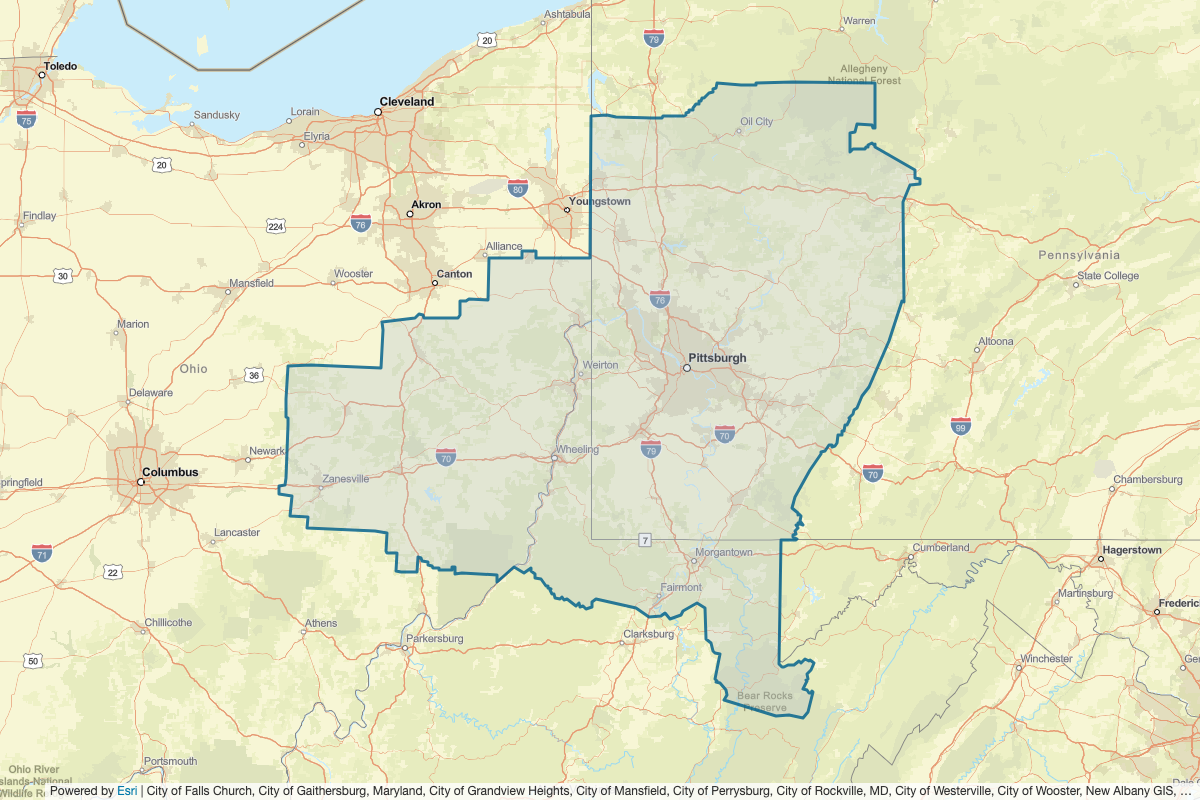 This includes Allegheny, Armstrong, Beaver, Butler, Cambria, Clarion, Clearfield, Crawford, Elk, Forest, Greene, Indiana, Jefferson, Lawrence, Mercer, Somerset, Venango, Warren, Washington, Ohio, Marshall, Hancock, Brooke, Fayette, Westmoreland, Doddridge, Garrett, Preston, Monongalia, Marion, Randolph, Wetzel, Barbour, Taylor, Tyler, Tucker, Harrison, Grant, Belmont, Carroll, Columbiana, Coshocton, Guernsey, Harrison, Holmes, Jefferson, Knox, Licking, Mahoning, Monroe, Morgan, Muskingum, Noble, Perry, Stark, Trumbull, Tuscarawas, and Washington