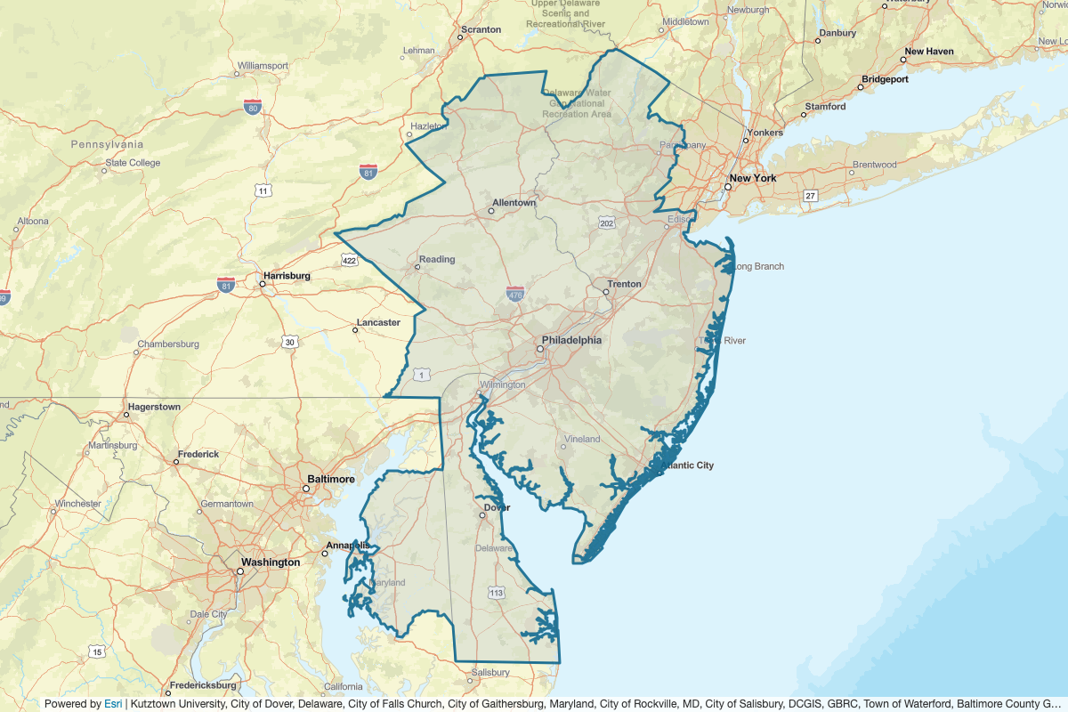 This includes Orange, Lackawanna, Lancaster, Lebanon, Luzerne, Pike, Schuylkill, Richmond, Union, Passaic, Wayne, Essex, Cape May, Monmouth, Atlantic, Ocean, Salem, Cumberland, Warren, Camden, Hunterdon, Mercer, Morris, Somerset, Sussex, Berks, Bucks, Lehigh, Monroe, Montgomery, Philadelphia, Carbon, Delaware, Gloucester, Northampton, Chester, New Castle, Middlesex, Burlington, Kent, Talbot, Worcester, Dorchester, Wicomico, Caroline, Kent, Sussex, Queen Anne's, and Cecil