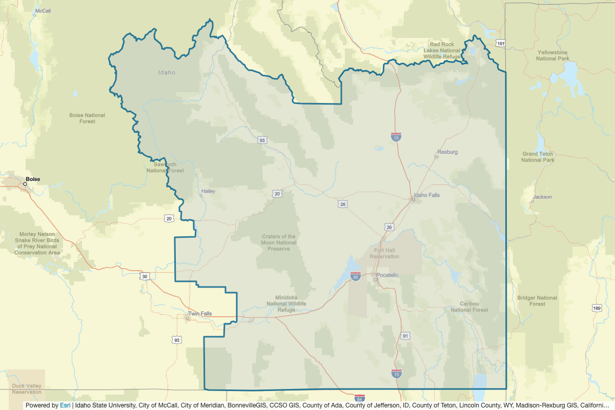 This includes Beaverhead, Madison, Fremont, Gallatin, Teton, Clark, Gooding, Jerome, Minidoka, Teton, Jefferson, Valley, Boise, Lemhi, Butte, Bonneville, Elmore, Blaine, Custer, Lincoln, Bear Lake, Caribou, Oneida, Rich, Lincoln, Bingham, Power, Camas, Twin Falls, Cassia, Bannock, Madison, Franklin, Elko, Cache, and Box Elder