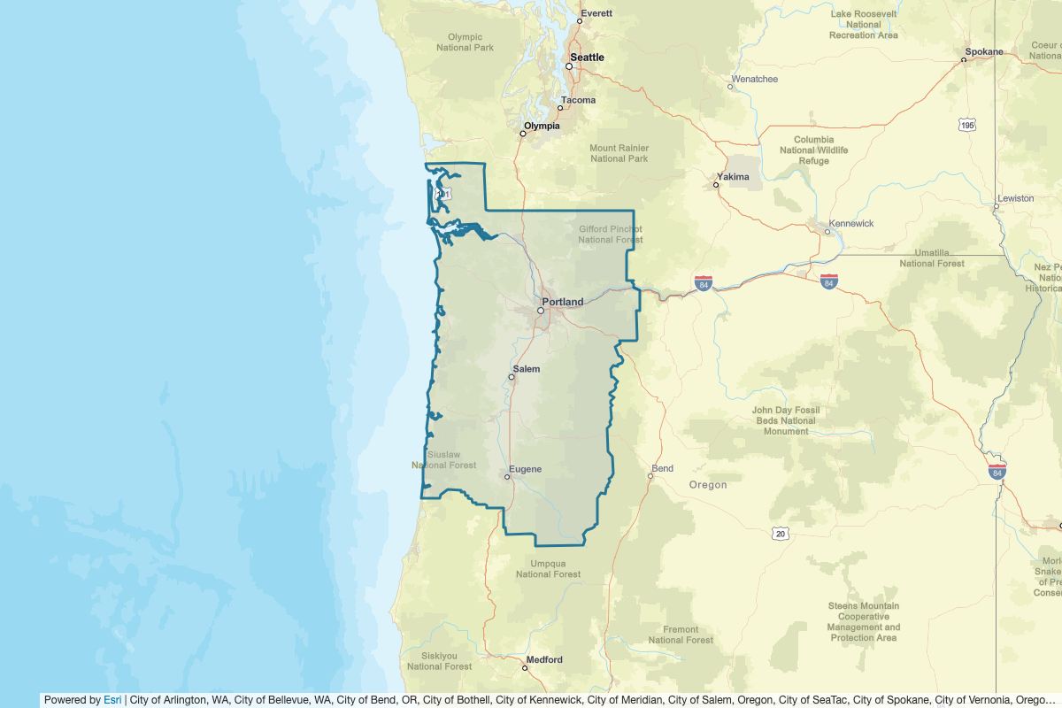 This includes Klickitat, Deschutes, Jefferson, Tillamook, Clatsop, Columbia, Washington, Yamhill, Marion, Linn, Hood River, Polk, Benton, Skamania, Cowlitz, Wahkiakum, Clark, Multnomah, Clackamas, Wasco, Lincoln, Pacific, Grays Harbor, Lewis, Lane, Klamath, and Douglas