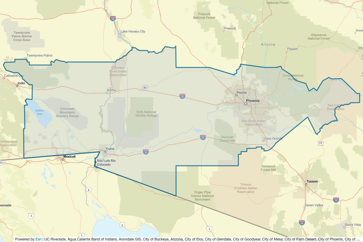 This includes Graham, Pima, Pinal, Yuma, Imperial, San Bernardino, Gila, Maricopa, La Paz, Mohave, Yavapai, San Diego, and Riverside