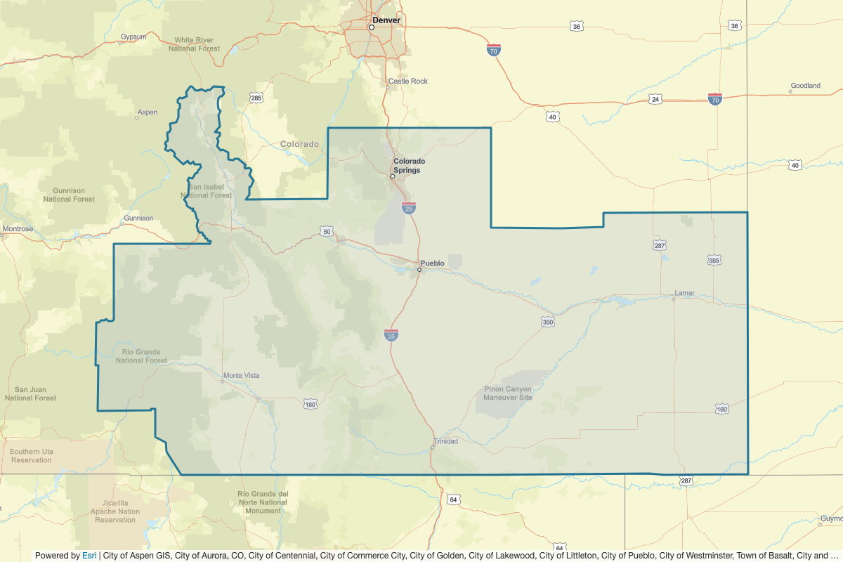 This includes Baca, Bent, Cheyenne, Crowley, Otero, Prowers, Stanton, Morton, Hamilton, Greeley, Cimarron, Gunnison, Hinsdale, Archuleta, Teller, Custer, Pueblo, Huerfano, Mineral, Conejos, Saguache, Fremont, Alamosa, Chaffee, Rio Grande, Costilla, Kiowa, Las Animas, Rio Arriba, Union, Taos, Colfax, Elbert, Park, Lincoln, Jefferson, Eagle, Summit, Douglas, Lake, El Paso, and Pitkin