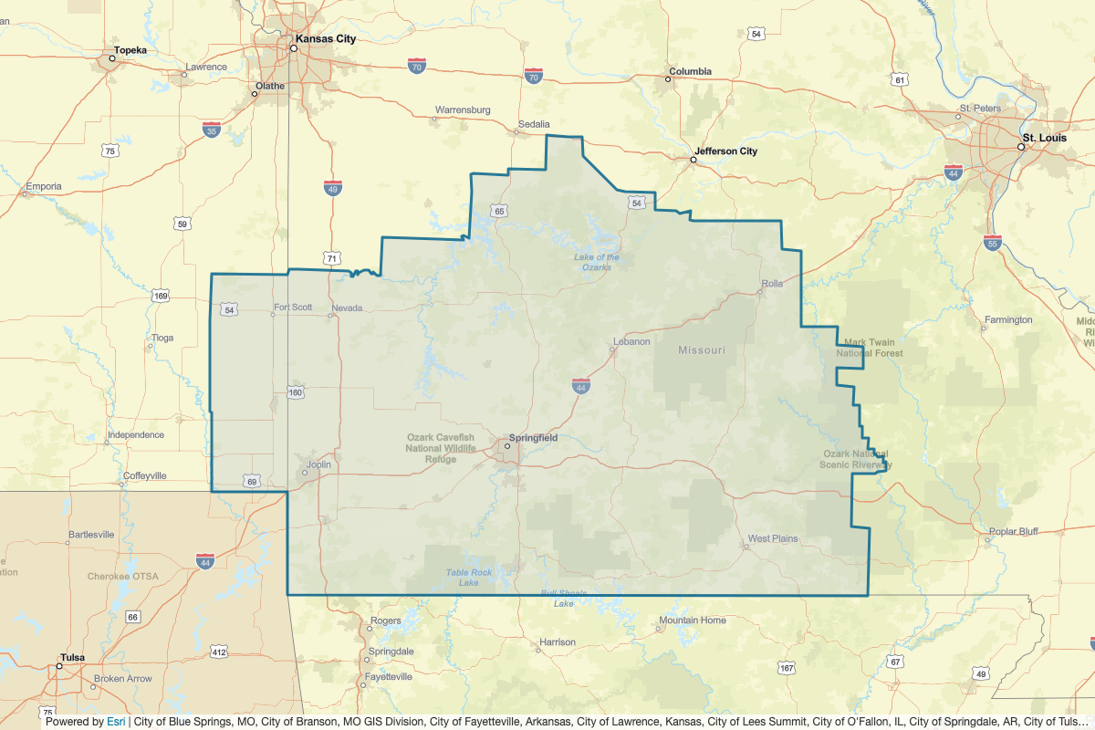 This includes Baxter, Benton, Carroll, Fulton, Marion, Randolph, Sharp, Boone, Barton, Bates, Benton, Camden, Carter, Cedar, Christian, Cole, Cooper, Crawford, Dent, Douglas, Gasconade, Greene, Henry, Hickory, Howell, Iron, Laclede, Barry, McDonald, Maries, Miller, Moniteau, Morgan, Newton, Oregon, Osage, Ozark, Pettis, Phelps, Polk, Pulaski, Reynolds, Ripley, St. Clair, Shannon, Stone, Taney, Texas, Vernon, Webster, Wright, Dade, Dallas, Lawrence, Jasper, Neosho, Linn, Labette, Allen, Bourbon, Cherokee, Crawford, Craig, Delaware, and Ottawa