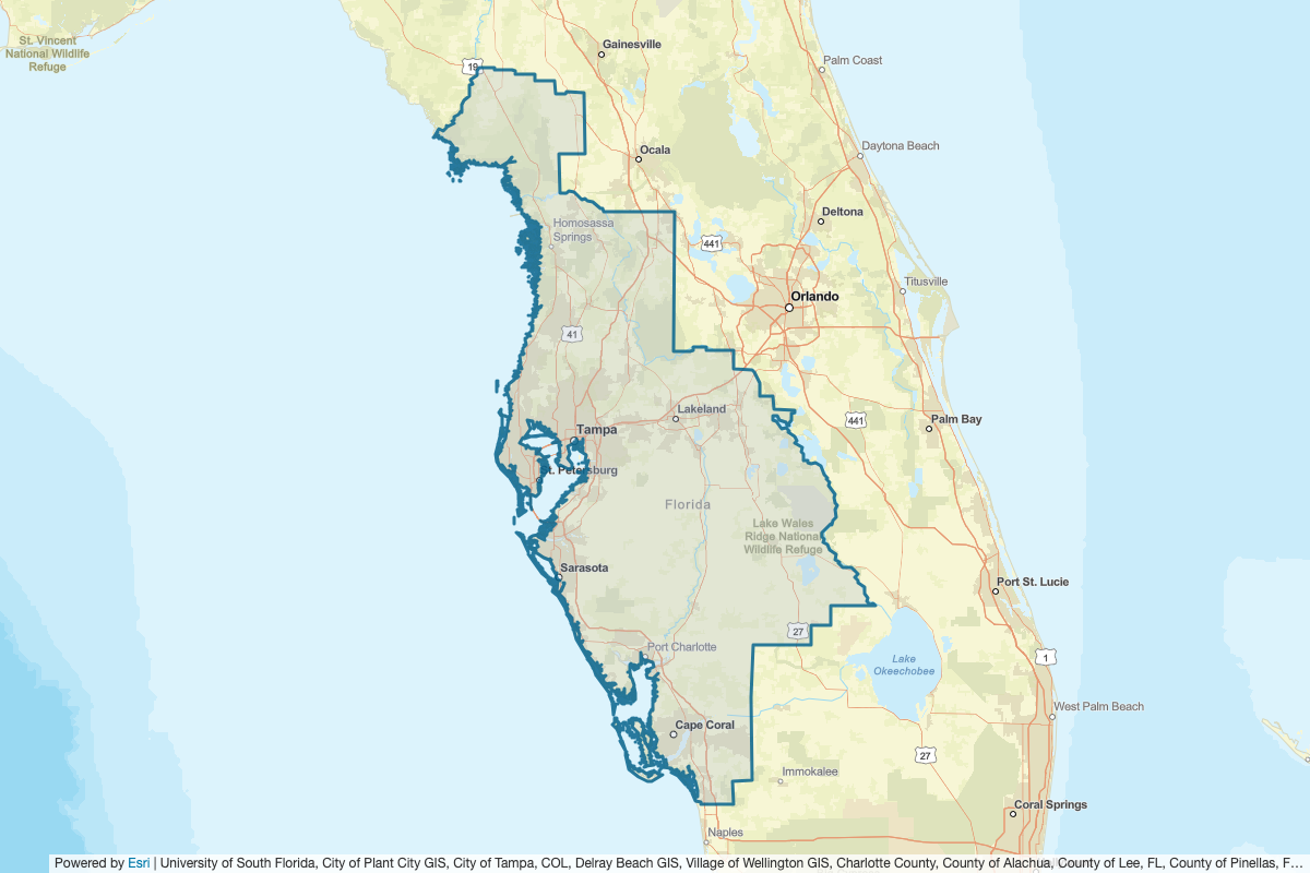 This includes DeSoto, Hendry, Hardee, Highlands, Osceola, Polk, Okeechobee, Glades, Sarasota, Collier, Alachua, Gilchrist, Marion, Sumter, Lake, Lee, Charlotte, Pinellas, Dixie, Levy, Citrus, Hernando, Pasco, Manatee, and Hillsborough
