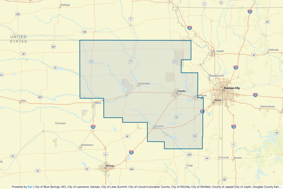 This includes Leavenworth, Washington, Gage, Jefferson, Riley, Republic, Pottawatomie, Nemaha, Mitchell, Marshall, Jewell, Jefferson, Jackson, Atchison, Brown, Clay, Cloud, Doniphan, Nuckolls, Pawnee, Richardson, Thayer, Woodson, Wabaunsee, Shawnee, Saline, Ottawa, Osage, Morris, Miami, Marion, McPherson, Lyon, Linn, Lincoln, Johnson, Greenwood, Allen, Anderson, Chase, Coffey, Dickinson, Douglas, Franklin, and Geary