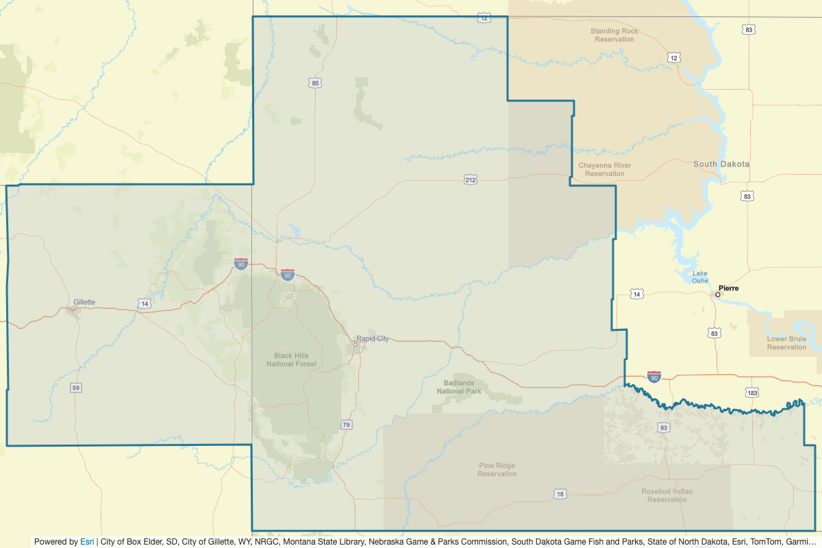 This includes Carter, Fallon, Powder River, Johnson, Weston, Crook, Campbell, Sheridan, Harding, Haakon, Dewey, Corson, Mellette, Butte, Jones, Adams, Bowman, Perkins, Lyman, Jackson, Ziebach, Sioux, Stanley, Meade, Pennington, Lawrence, Custer, Gregory, Bennett, Keya Paha, Tripp, Todd, Cherry, Dawes, Sheridan, Oglala Lakota, Sioux, Fall River, Niobrara, and Converse